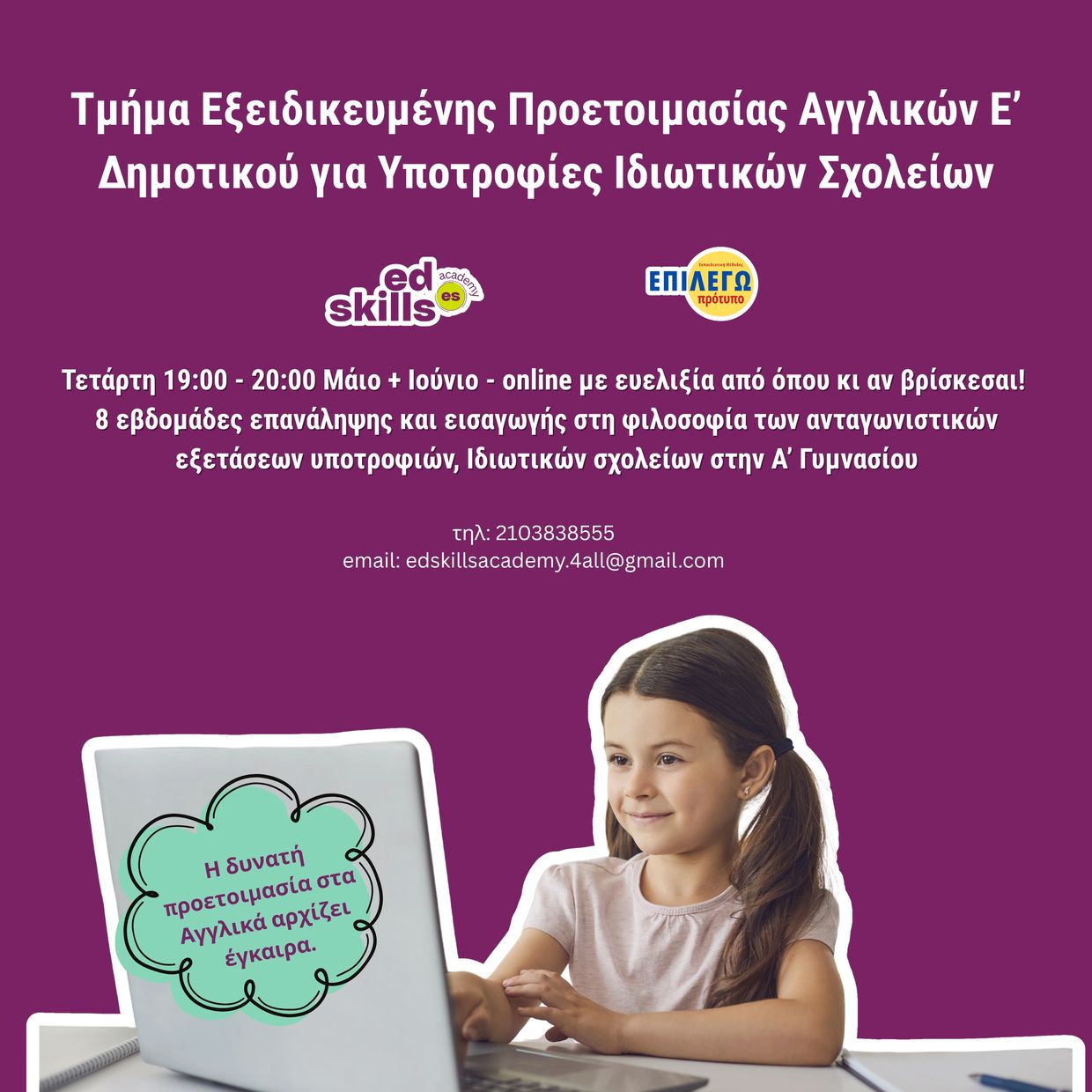 Γι’ αυτό, μετά το Πάσχα ξεκινά ένα 8 εβδομάδων online επαναληπτικό πρόγραμμα Αγγλικών για μαθητές που τελειώνουν την Ε΄ Δημοτικού και θέλουν να μπουν στην ΣΤ΄ Δημοτικού με καλύτερη βάση, μεγαλύτερη αυτοπεποίθηση και ουσιαστική ετοιμότητα.